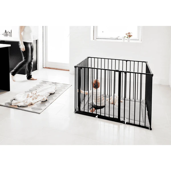 De speelmat met grappige karakters brengt plezier en wekt de interesse van het kind – en kan daarnaast ook zonder de box gebruikt worden. Wanneer de box niet meer nodig is kan deze eenvoudig worden omgebouwd tot een super praktisch hekje voor brede deuren, openhaarden, enz.