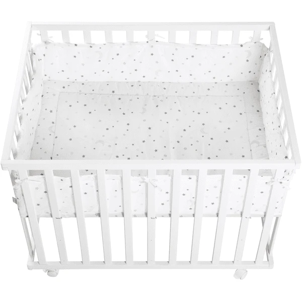 De roba box ‘Sternenzauber grau’ in de kleur wit biedt een kindvriendelijk en stabiel speel- en knuffeloppervlak van 75 x 100 cm en is voorzien van een zacht gewatteerde, gewatteerde grijze stoffen inzet. De roba box is babyvriendelijk en splintervrij. De bovenste stand van de in 3 standen in hoogte verstelbare boxbodem is voor u als ouders bijzonder rugvriendelijk. Vier remrollen zorgen voor de nodige mobiliteit en stabiliteit van deze box. Alle in de box gebruikte materialen zijn getest op schadelijke stoffen en gecertificeerd. Bovendien worden zij tijdens de fabricage regelmatig getest. De box is ontwikkeld volgens de EN 12227:2010 norm. Het stoffen inzetstuk van de 4-hoekige roba box ‘ roba Style ‘ is uitneembaar en wasbaar op 40° C. De babybox heeft de afmetingen 72,5 x 75 x 100 cm (HxBxD) en is belastbaar tot een gewicht van 15 kg.