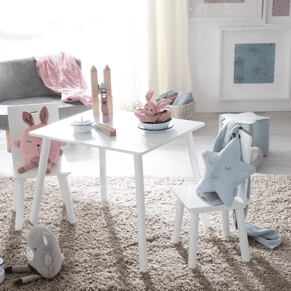 Het bestaat uit een aantrekkelijke kindertafel en twee bijpassende stoelen.