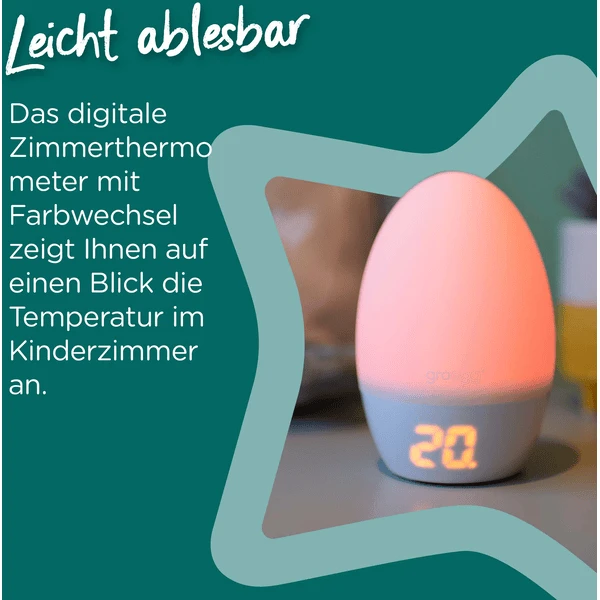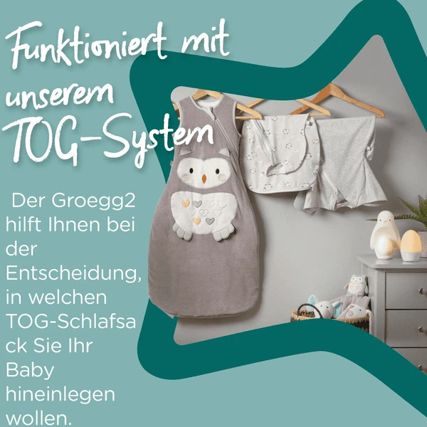 De Groegg2 helpt u beslissen welke slaapzak met welke TOG-waarde* het meest geschikt is voor uw baby. Door de juiste TOG-waarde* te kiezen, bent u verzekerd van een rustgevende en veilige slaap voor uw baby. De afgebeelde kleur dekt een reeks temperaturen. Dit kleurengamma is ook terug te vinden in de Tog-etikettering van Tommee Tippee beddengoed en nachtkleding. Naast het innovatieve kleurwisselsysteem en de temperatuurweergave van Tommee Tippee heeft de Groegg2 ook een dimfunctie. Met deze functie kan de helderheid worden aangepast. Dit betekent dat het ook kan worden gebruikt als nachtlampje of om de helderheid aan te passen aan uw baby.