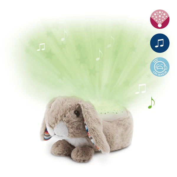 Ruby, het schattige pluche konijntje met een sterprojector op zijn rug, tovert een magische sterrenhemel naar het plafond. Voor de sterprojecties kunt u kiezen tussen drie kleuren of wisselende kleuren. Hartslag, lawaai of loungemuziek zijn beschikbaar voor de rustgevende geluiden. Na ca. 30 minuten gaat het licht automatisch uit en na ca. 15 minuten gaat het geluid automatisch uit. Als de geluidssensor wordt geactiveerd, gaat het licht weer aan als de baby huilt. Ruby werkt op batterijen. Er zijn drie AA-batterijen nodig. De batterijen zijn NIET bij de levering inbegrepen Het is geschikt vanaf de geboorte.